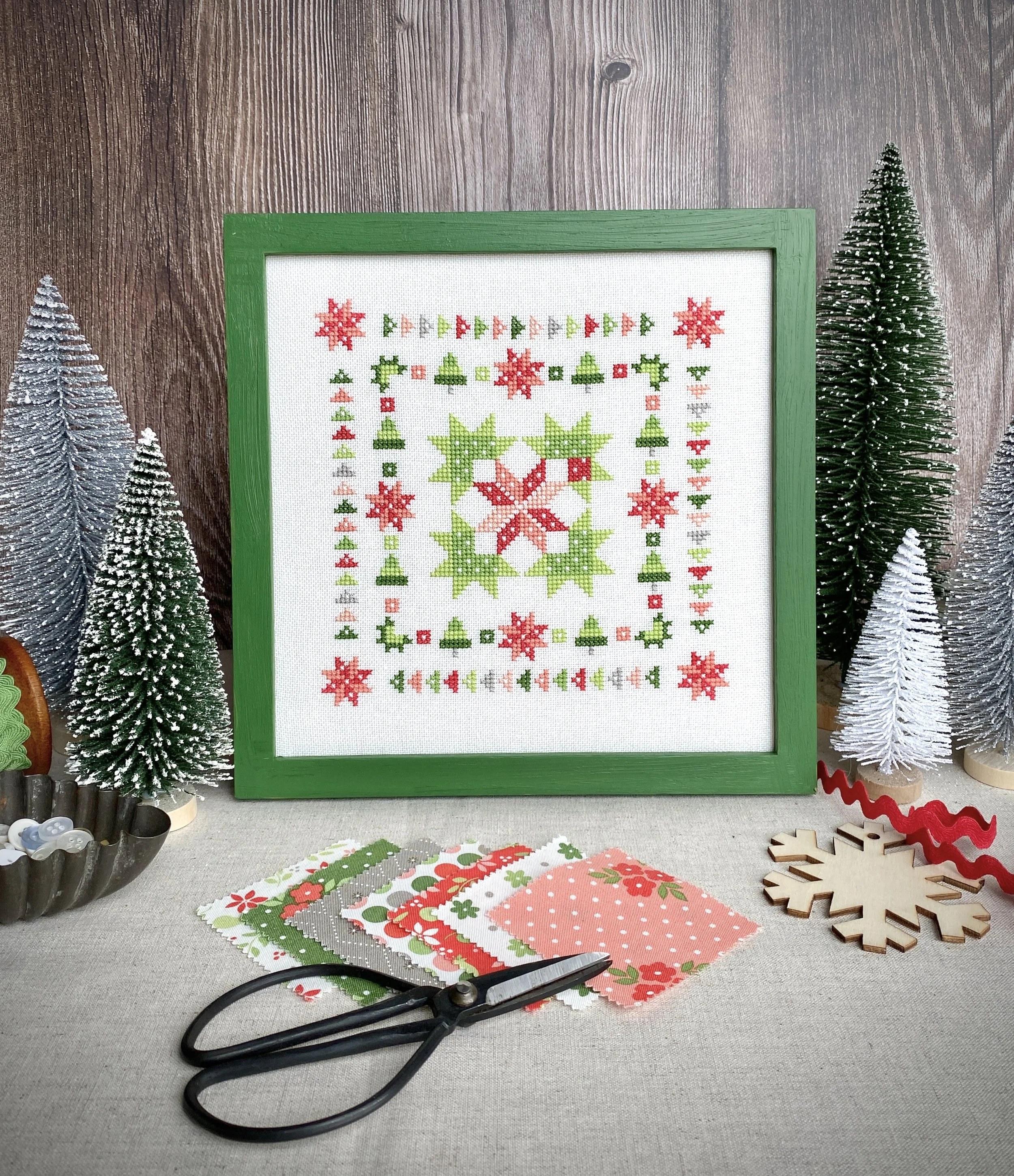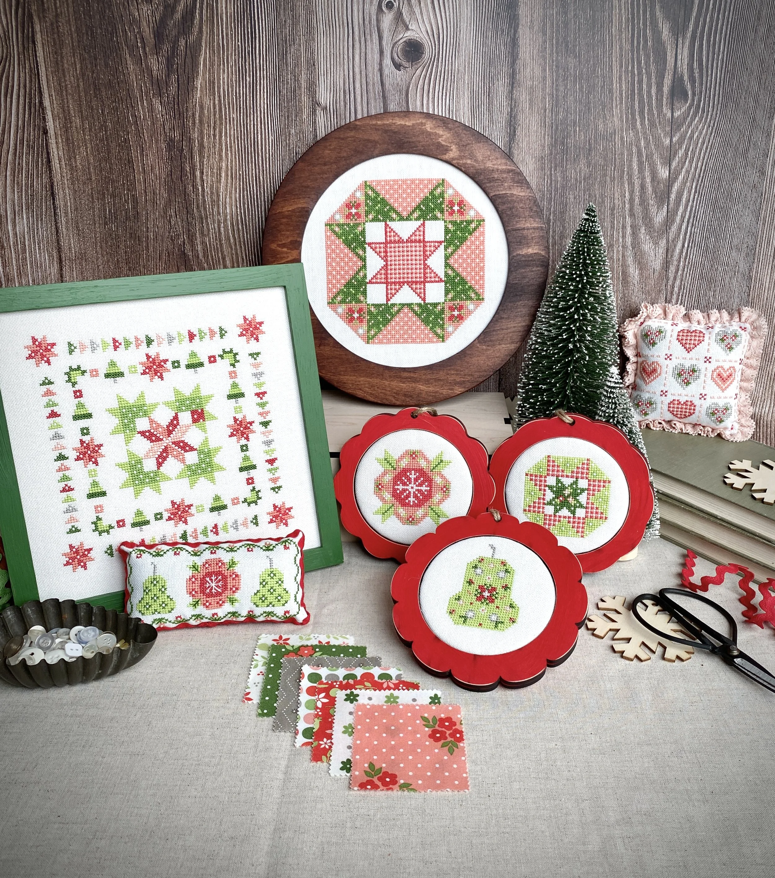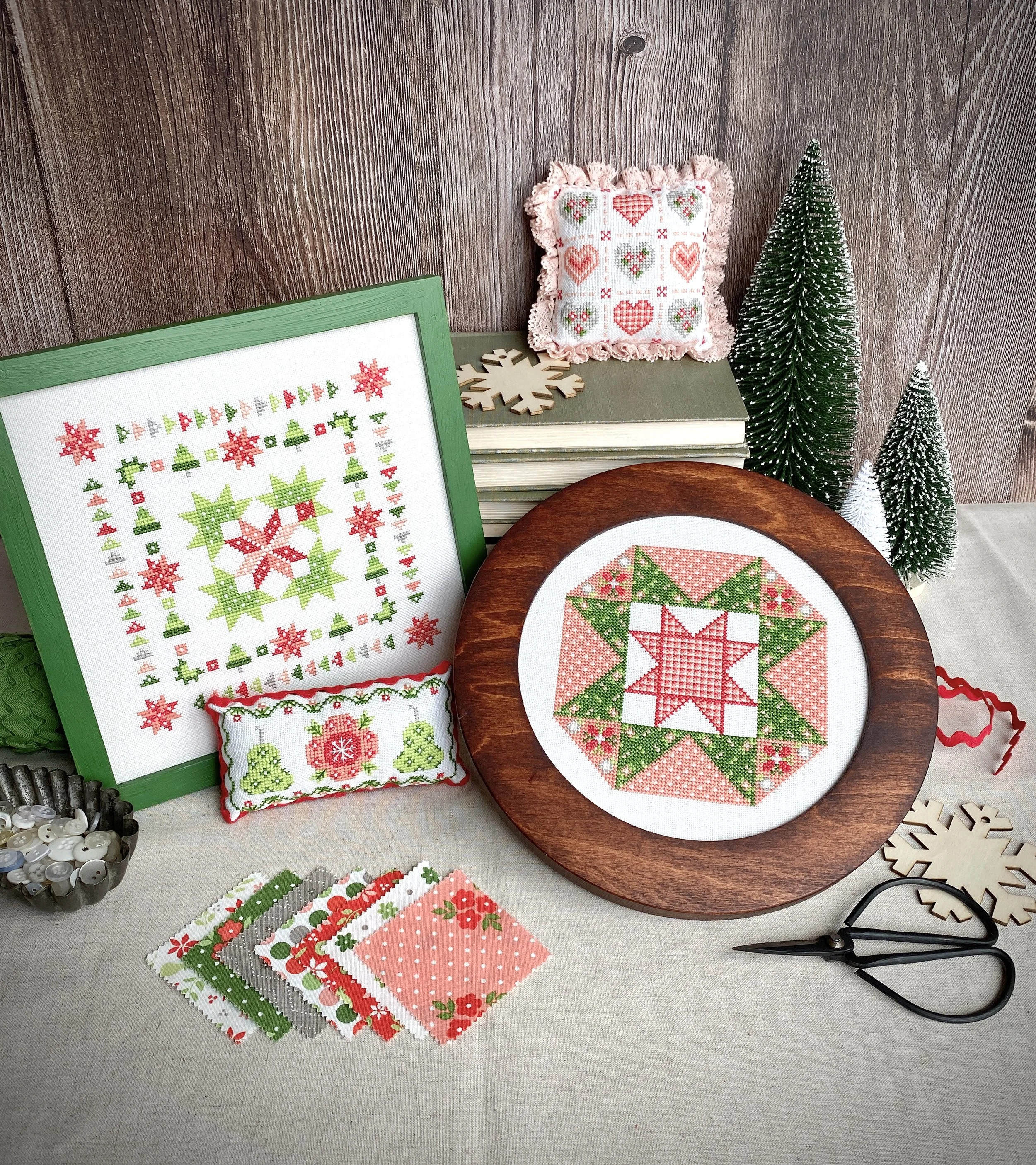 I am so excited to share about a new collection of patterns! These 4 (plus a free bonus) new designs are a special collaboration with Sherri McConnell for the release of the new fabric line, Poinsettia and Pear, by Sherri and Chelsi for Moda Fabrics. I feel so fortunate to work with Sherri again, and I just love creating cross stitch pieces that coordinate with her beautiful quilt patterns. The matching colors make these the perfect hand-stitched projects to display alongside Poinsettia and Pear Quilts!