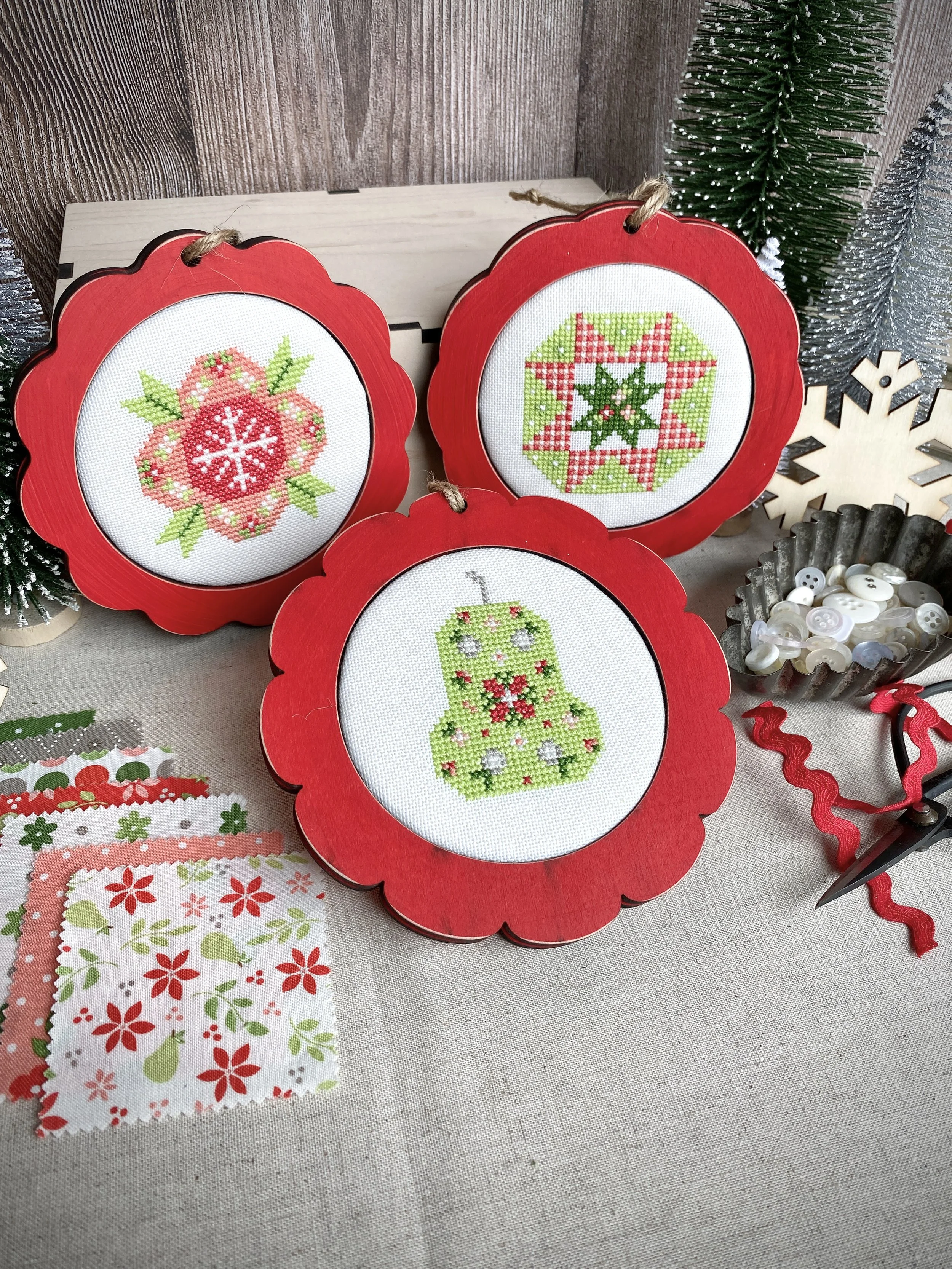 Now for the good stuff… pictures! I am offering bundle price for all 4 patterns (paper or PDF), and each pattern is also available individually. Plus, don’t miss the FREE bonus pattern, which you can find below. These ornaments are finished with the Round Ornament Trio from Chantelle’s 141.