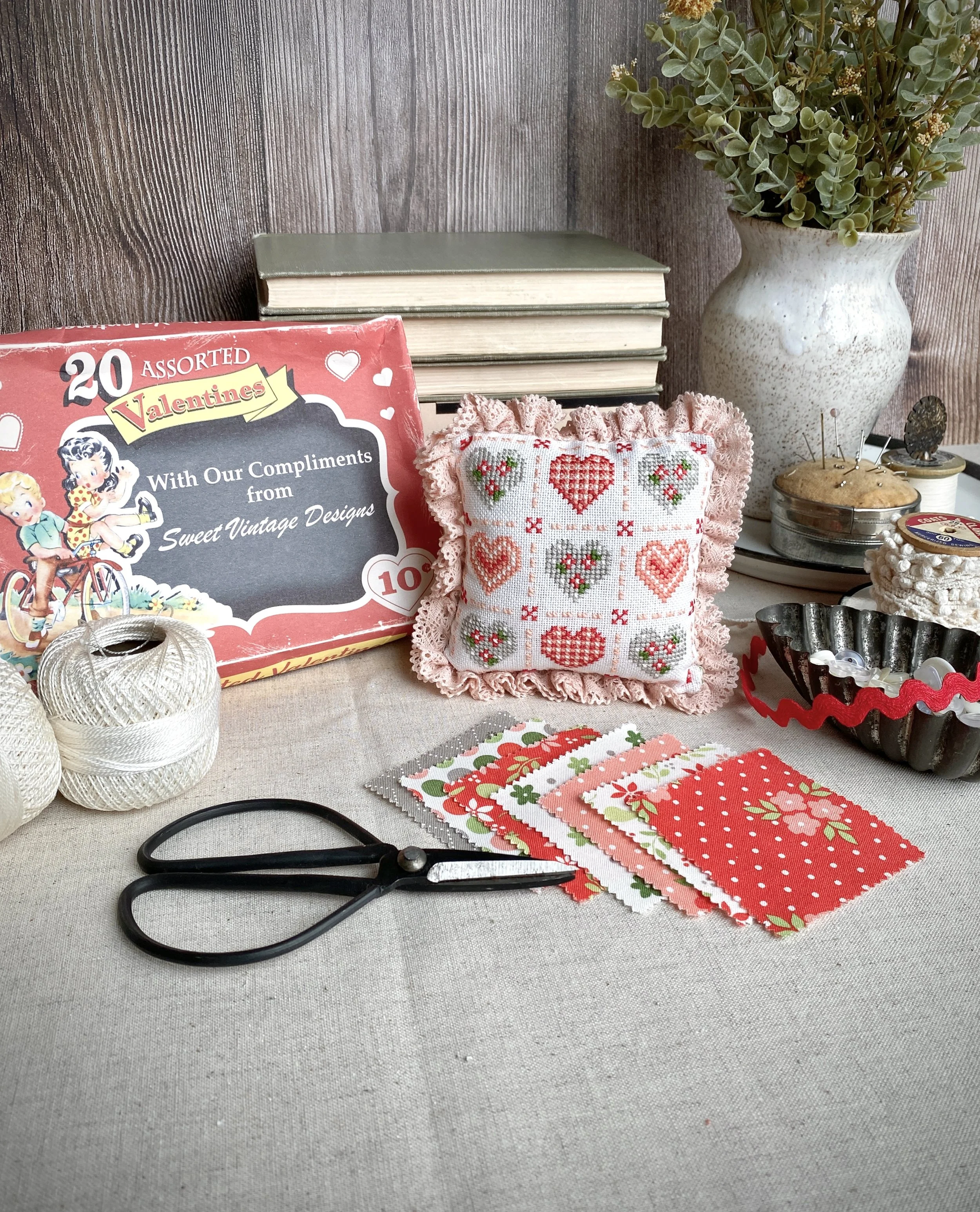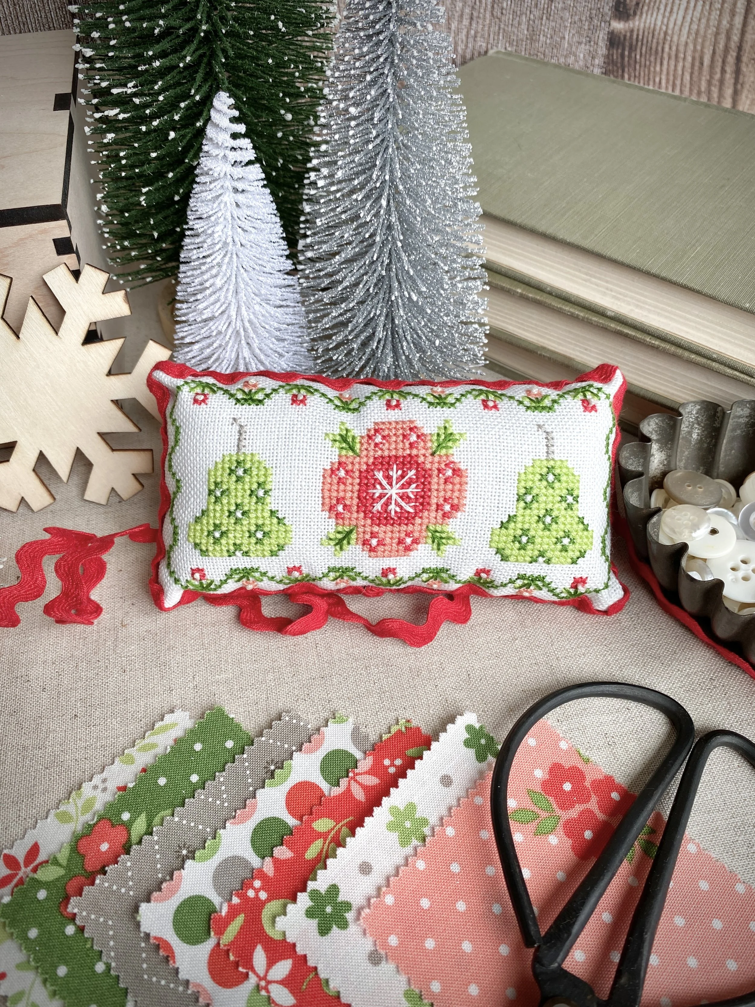 This cute little stitch is so fun and fast to whip up! It shows the versatility of the colors in this fabric line, you can stitch from Christmas to Valentine’s Day and beyond. I wanted to show off little details that you will find in Poinsettia and Pear, including gingham and sweet florals. I finished this design as a pillow with cinched lace edges.