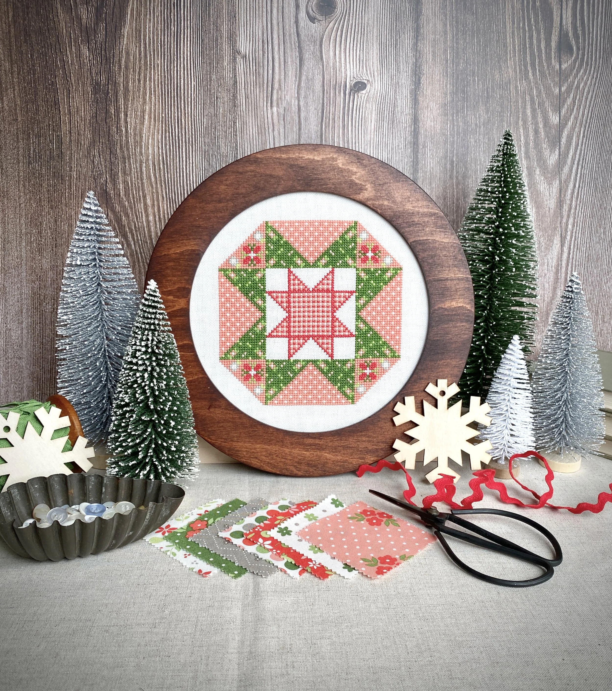I saved my favorite for last. One thing I love to do, is take a quilt block, and instead of making it super mini in a cross stitch version of a quilt, I like to make it a bit bigger (almost the size it would be in a quilt). It gives me the opportunity to mimic the beautiful designs in the fabrics. In this design, the center star captures the look of gingham, while the outer star takes on the look of a medium floral. The corners focus more on a large floral, while the background fabric of the “flying geese” is a mini polka dot. I finished this sample in a 7” circle frame from Modern Hoopla.